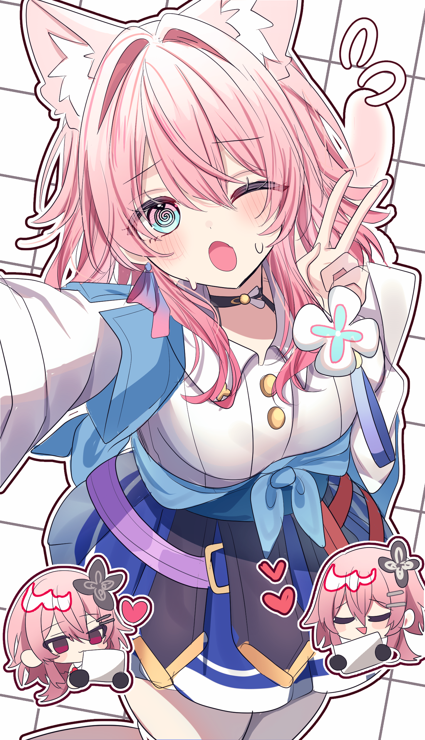 :o1boy2girlsanimal ear fluffanimal earsblue eyesblue jacketblushcat earscat girlcat tailchibichibi insetclosed eyescowboy shotgradient eyesgrid backgroundheartholdingholding paperjacketmulticolored eyesmultiple girlsone eye closedoutlinepaperpink eyespink hairred eyesshirtshort hairsmiletailtied jacketvwhite backgroundwhite shirt