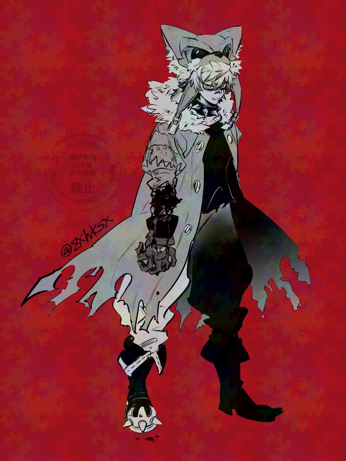 sidu (dsd kgn), mashiro meme, mashiro meme (1st costume), nijisanji, highres, 1boy, arms behind back, black background, bow, chest harness, clothing cutout, coat, cowboy shot, empty eyes, grin, hair between eyes, hair bow, harness, head tilt, hip vent, holding, holding shovel, long sleeves, looking at viewer, male focus, necktie, open clothes, open coat, open collar, pants, red bow, red scarf, safety pin, safety pin hair ornament, scarf, short hair, short necktie, shovel, smile, solo, spot color, square-end necktie, suspenders, trench coat, virtual youtuber