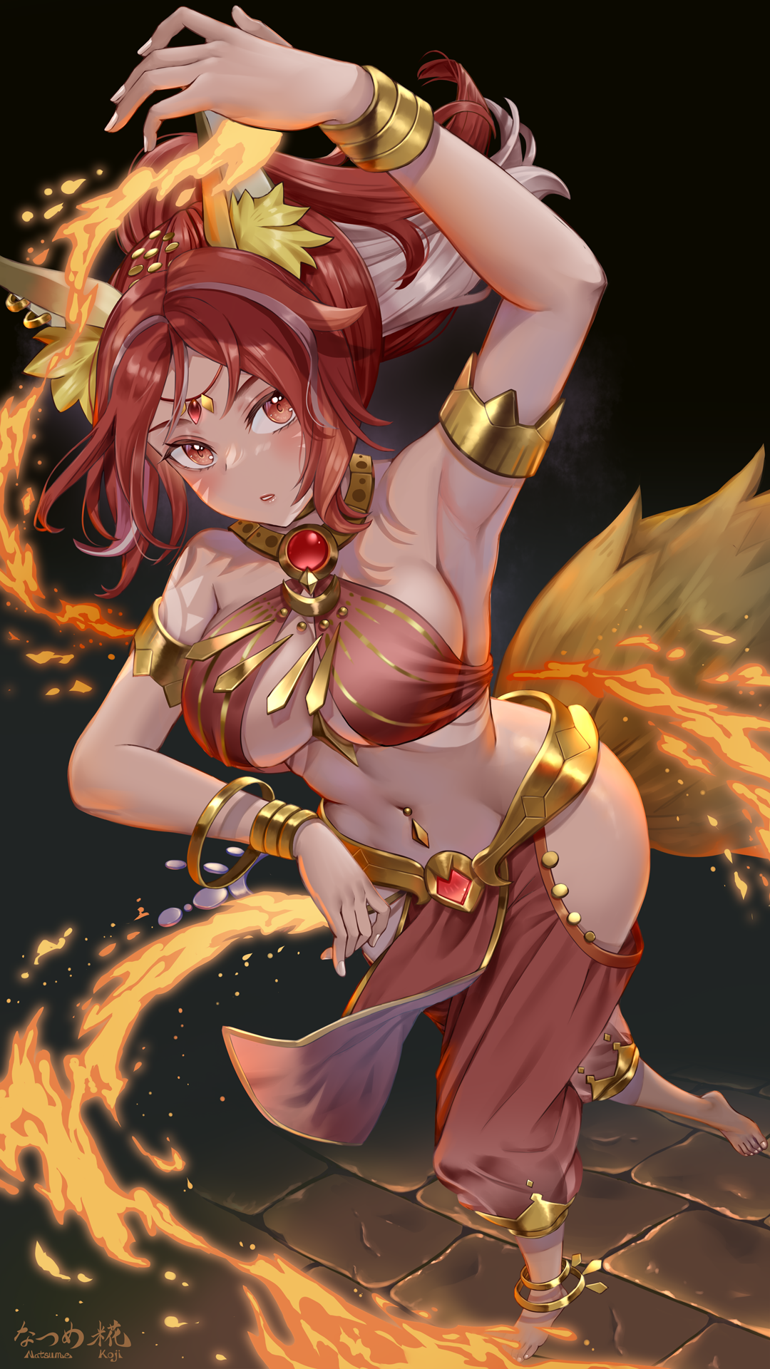 1girlanimal earsankletarm uparmletarmpitsbare hipsbare shouldersbarefootbikinibikini top onlybraceletbreastsbroochcleavageclothing cutoutdancerfantasyfirefox earsfox tailgold trimharem outfitharem pantship ventjewelrylarge breastslong hairlooking at viewermidriffnavelnavel piercingpantspiercingponytailred bikinired eyesred hairshiny skinsoloswimsuittail