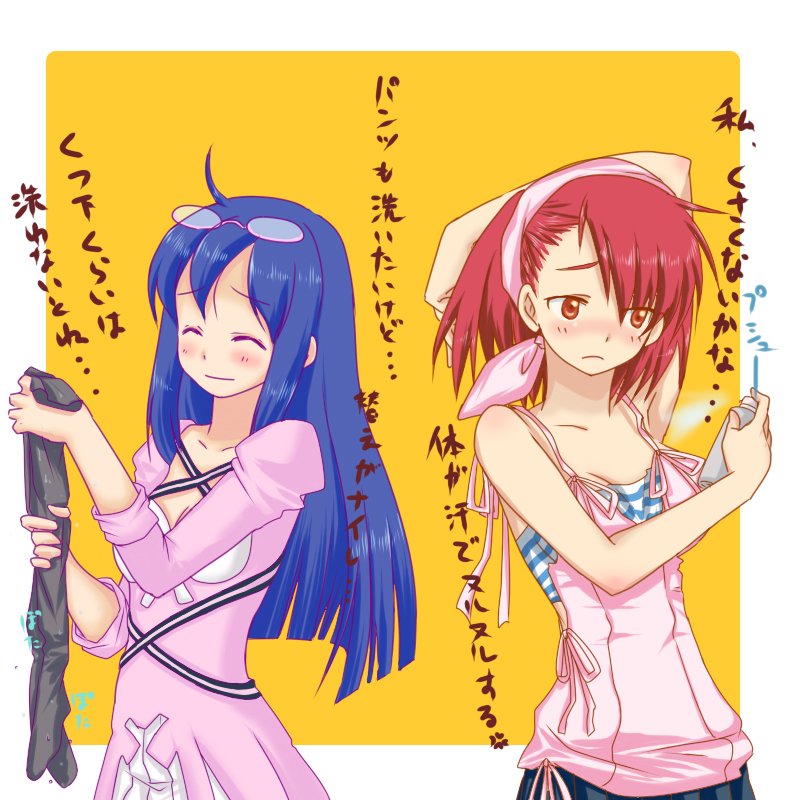 2girlsarmpitsbandanablue hairblushcamisoledressglasseslong hairmultiple girlsorange eyesred hairribbonshort hairsmellstraplesstank topthighhighstube topwet