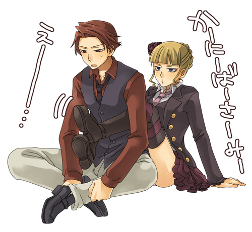 amate yuzuriha, shuji ito, gundam, gundam gquuuuuux, commentary, hashtag-only commentary, highres, 1boy, 1girl, alternate costume, aqua eyes, aqua shirt, artist name, bag, baggy pants, baseball jersey, blue pants, blue tank top, casual, closed eyes, collared shirt, donguziddd, drink, eyewear on head, fashion, grin, hand in pocket, holding, holding drink, jersey, long sleeves, medium skirt, midriff, mouth hold, multicolored eyes, multicolored hair, neckerchief, one eye closed, open clothes, open shirt, orange neckerchief, orange skirt, overshirt, pants, red hair, red shoes, shirt, shoes, short hair, shoulder bag, skirt, smile, sneakers, standing, standing on one leg, striped tank top, sunglasses, tank top, two-tone eyes, two-tone hair, unbuttoned, unbuttoned shirt, watch, wavy hair, white shirt, white shoes, white tank top, wristwatch