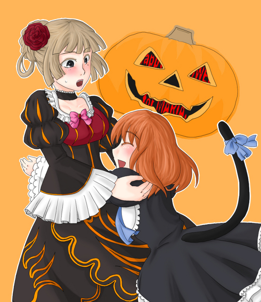 horobu, executor (arknights), suzuran (arknights), virtuosa (arknights), vulpisfoglia (arknights), arknights, absurdres, commentary, highres, 1boy, 2girls, animal ear fluff, animal ears, black eyes, black gloves, black hair, blonde hair, blue hairband, blunt bangs, braid, braided hair rings, closed eyes, earpiece, fox ears, gloves, hair rings, hairband, halo, heart, hug, long hair, multicolored hair, multiple girls, open mouth, smile, two-tone hair, white background, wings