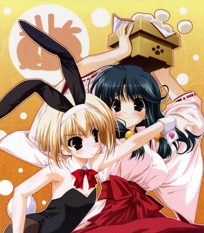 2girlsanimal earsblonde hairblue hairbrown eyesdangofake animal earsfoodjapanese clotheslong hairmikomultiple girlspantyhoseplayboy bunnyrabbit earsshort hairwagashi