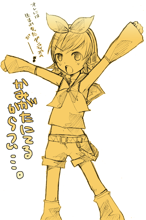1boycosplaydetached sleeveshair ornamenthairclipheadphoneskagamine rin (cosplay)male focusmonochromeribbonshortssolotrap
