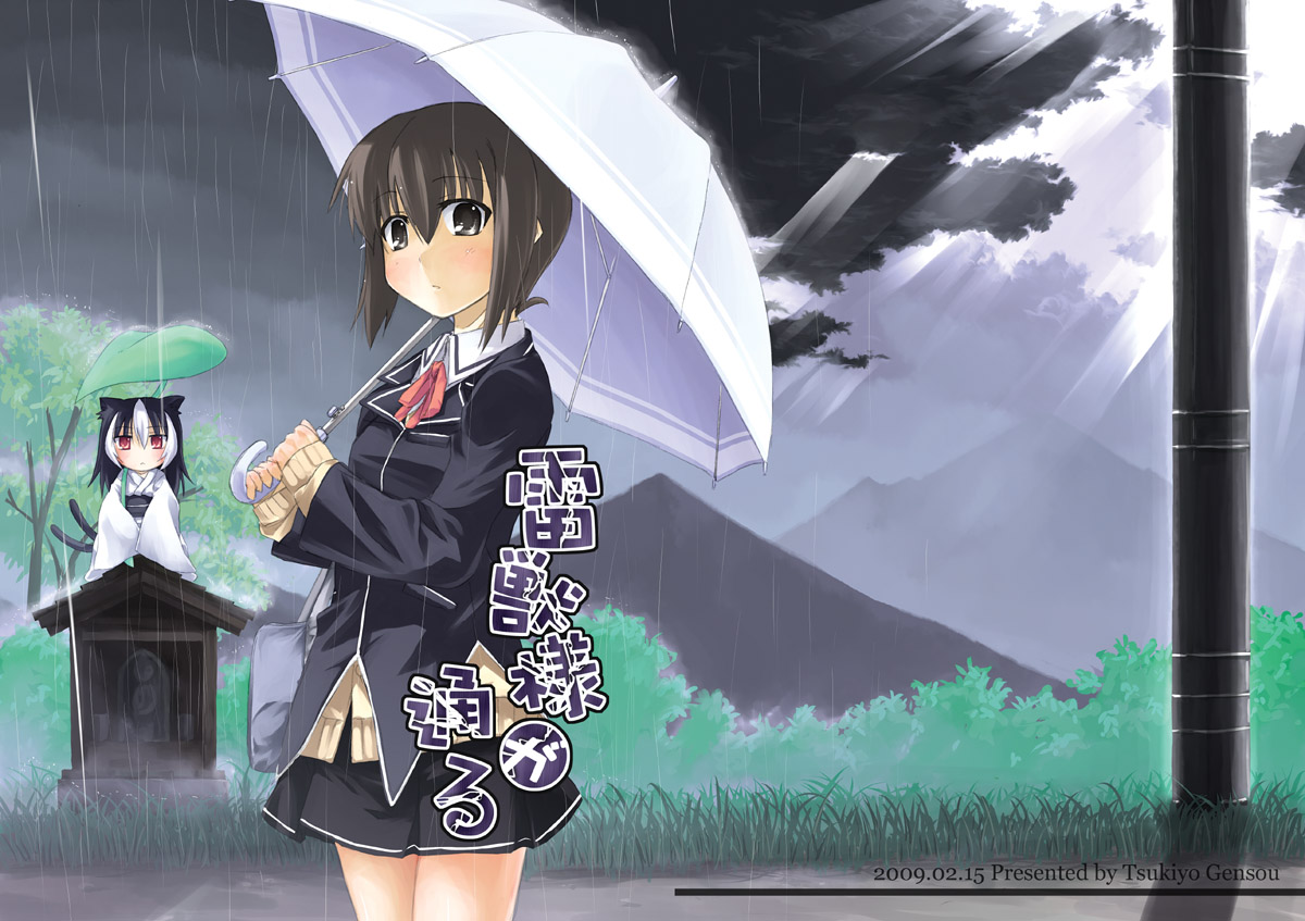 2girlsanimal earsblack eyesblack hairblushbushcat earscat tailchibicloudcoverdark cloudgrassjapanese clothesjizouleaf umbrellalong hairmini personminigirlmountainmulticolored hairmultiple girlsrainred eyesschool uniformshort hairshrineskirtskystatuesunlighttailtwo-tone hairumbrellawhite hair