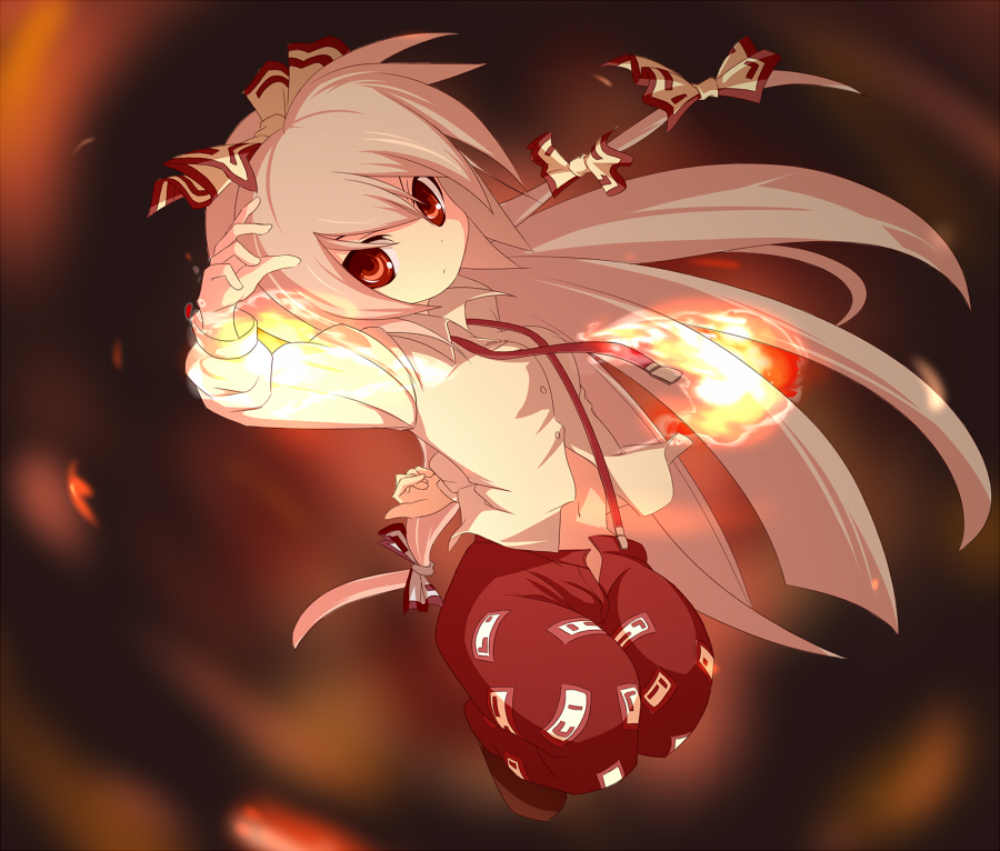 senmu (0107), flandre scarlet, embodiment of scarlet devil, touhou, bad id, bad pixiv id, 1girl, blouse, contemporary, female focus, foreshortening, hair between eyes, hat, mob cap, pink hat, pink shirt, red background, shirt, solo