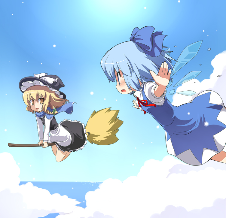 2girlsblonde hairblue eyesblue hairbroombroom ridingclouddayeye contactfemale focusflyinghatlooking at anothermultiple girlsoceanoutstretched armsribbonscarfshort hairskyspread armswingswitchwitch hatyellow eyes