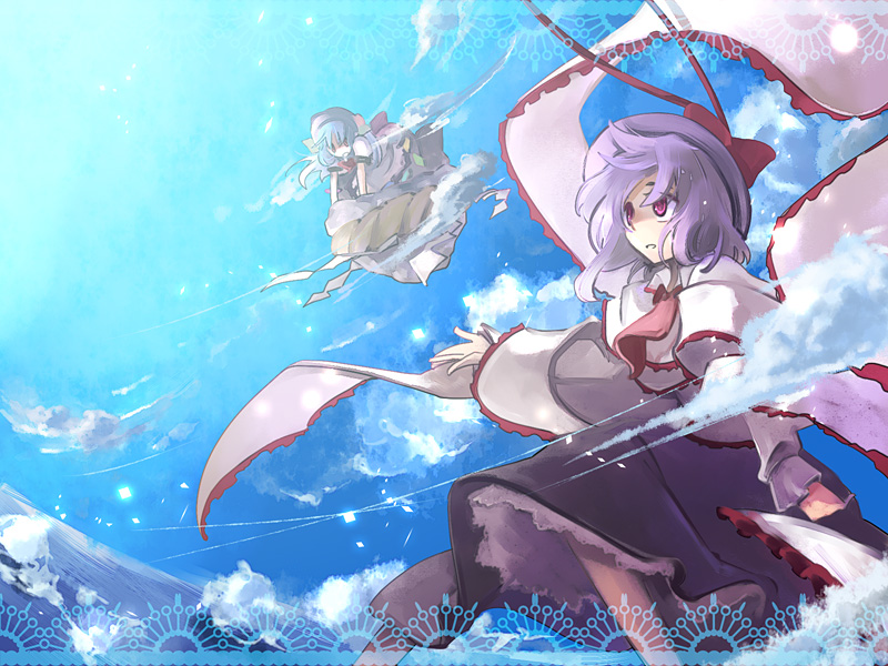 2girlsall foursblue hairblue skycapeletclouddayfemale focusfisheyefloatingfoodfrillsfruithathorizonkaname-ishilandscapemultiple girlsoutdoorspeachpurple hairred eyesribbonrockropescarfshawlshimenawashort hairsky