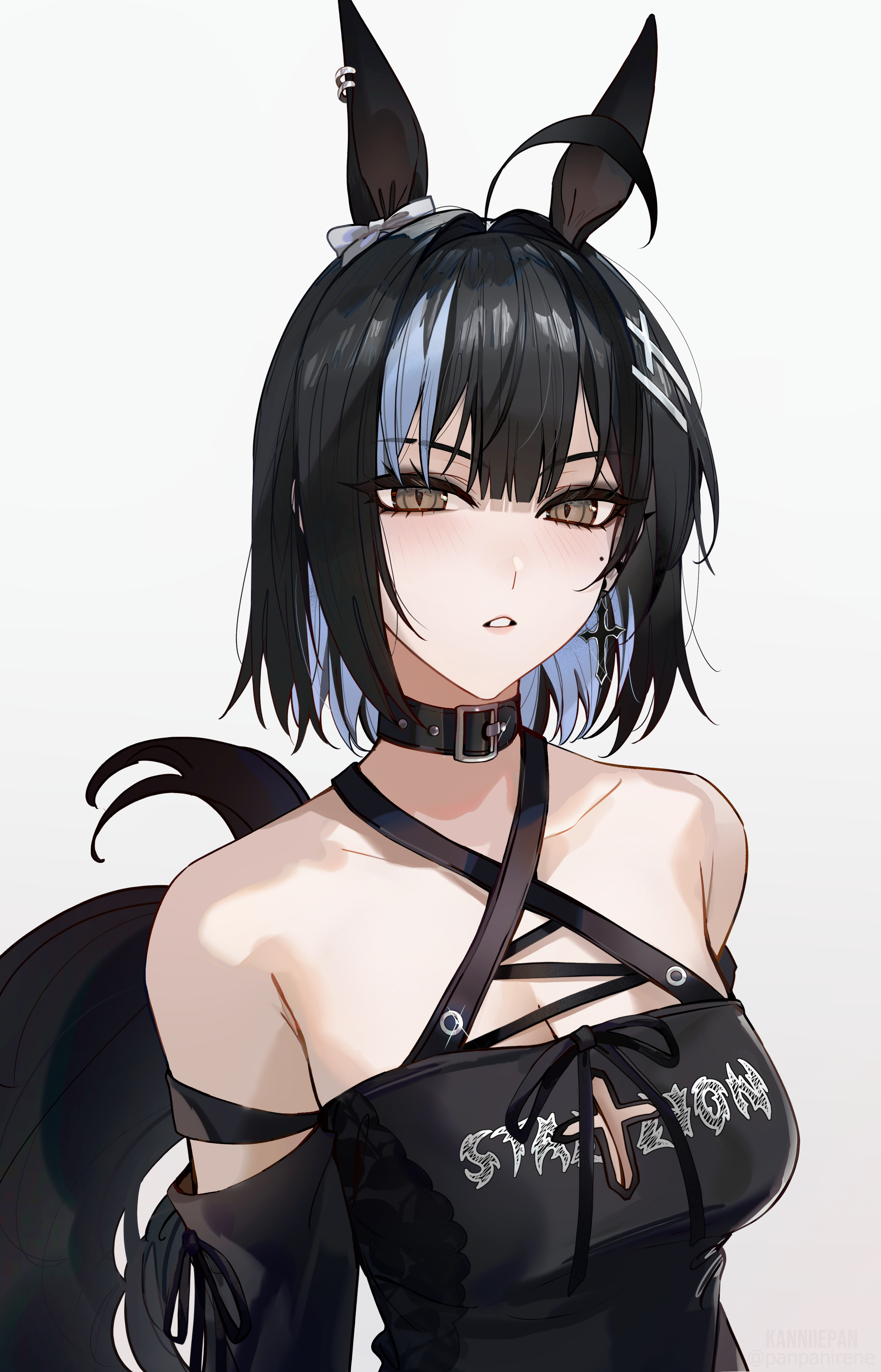 1girlahogeanimal earsbare shouldersblack collarblack hairblack shirtblue hairblushbreastsbrown eyescleavagecollarcollarbonecrosscross earringsearringsgrey backgroundhorse earshorse girlhorse tailjewelrykemonomimi modelooking at viewermedium breastsmolemole under eyeparted lipsshirtshort hairsimple backgroundsingle earringsolotailupper body