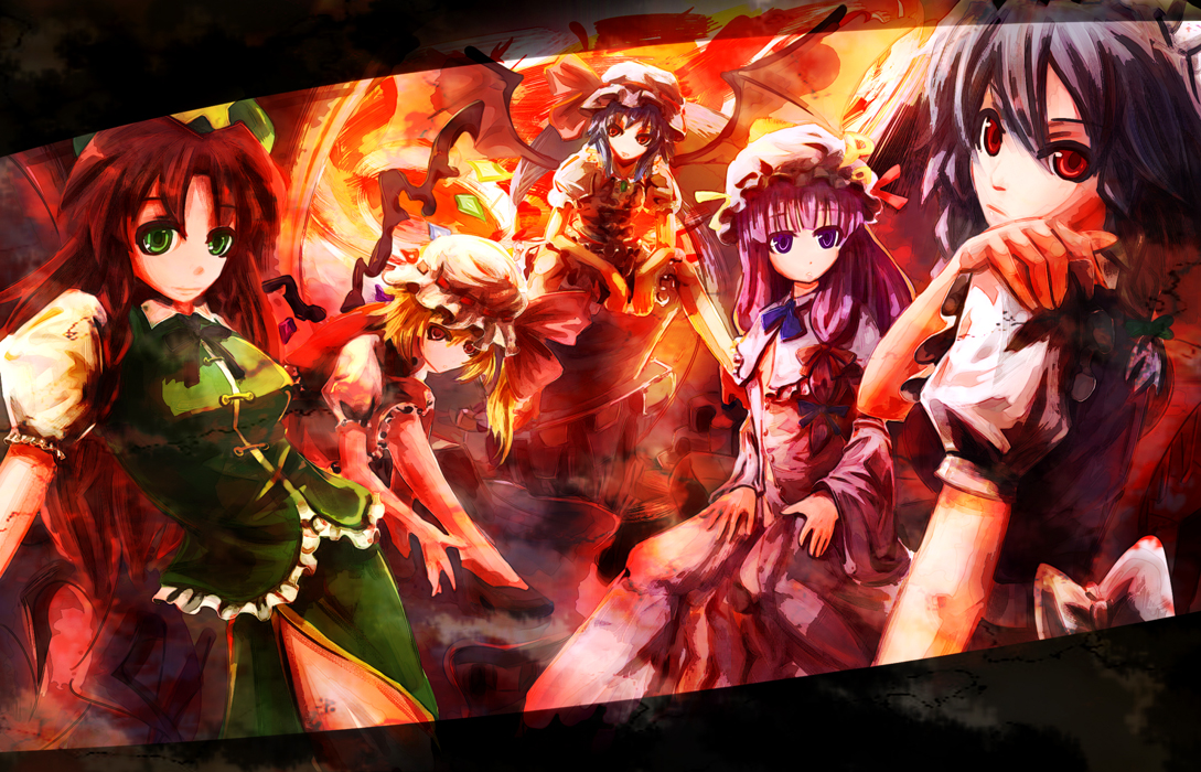 5girlsbat wingsbreastsdressfemale focushairbandhatmaidmultiple girlsred eyesribbonshort hairskirtwings