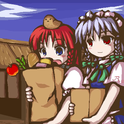 2girlsanimalanimal on headbagbirdbird on headblue eyesblushbraidcosplaydayfemale focusfoodgroceriesizayoi sakuya (cosplay)multiple girlsoekakion headpaper bagred eyesred hairribbonshort hairside braidskyspilltwin braids