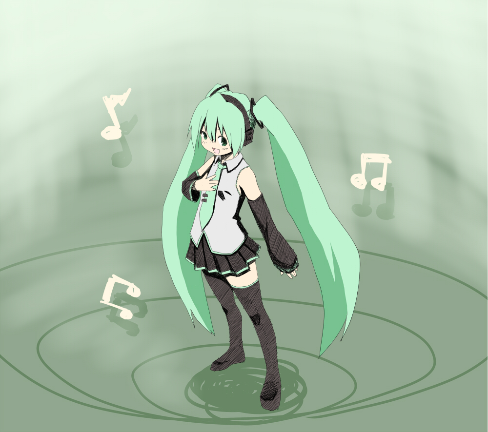 detached sleevesgreen eyesgreen hairlong hairmusical notenecktieskirtsolothighhighstwintailsvery long hairzettai ryouiki