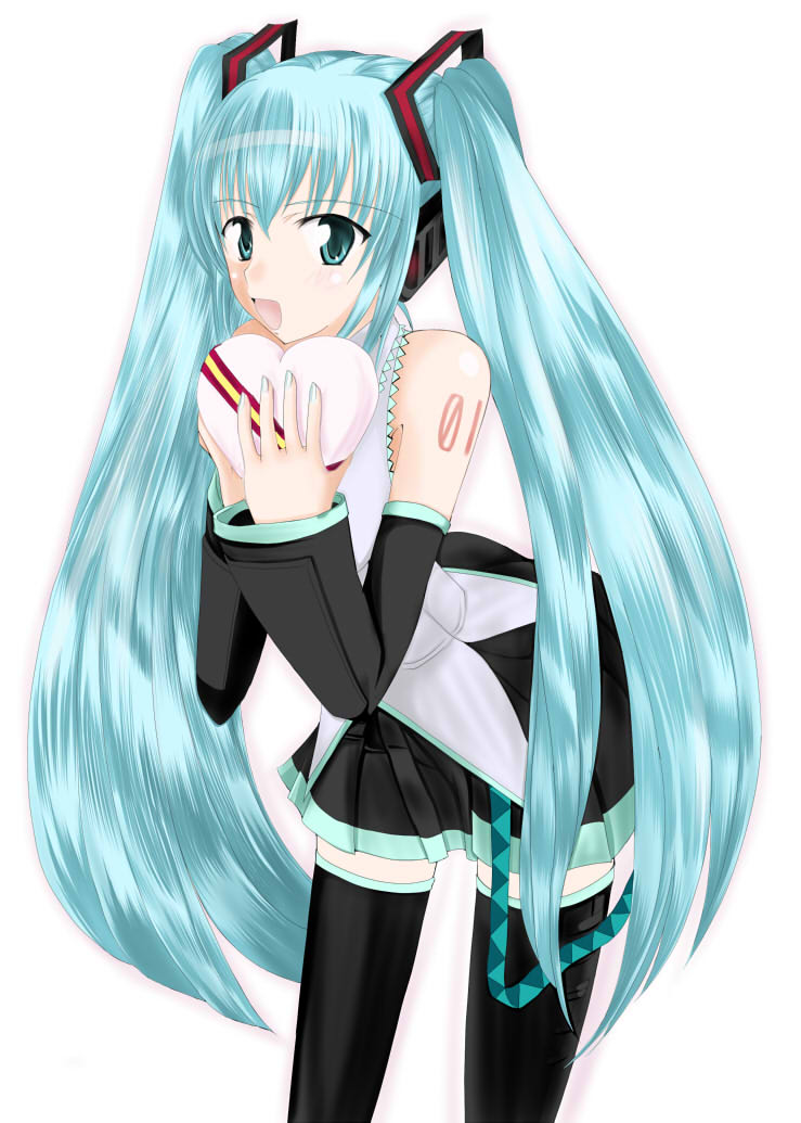 aqua eyesaqua hairdetached sleeveslong hairskirtsolothighhighstwintailsvalentinevery long hair