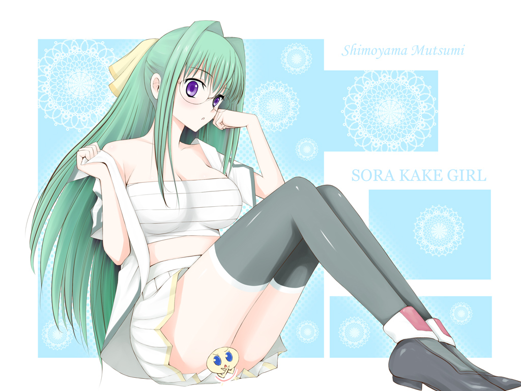 00s1girlblushbreastsfemale focusglassesgreen hairlarge breastslong hairlong legspurple eyessarashisittingskirtsolothighhighsundressing
