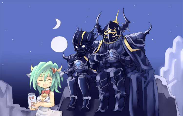 1990s (style)1girl2boysanimal printarmorblushbottlebreastscleavagecow girlcow printcrescent mooncupdark knightfull armorfull moongreen hairhornsmedium breastsmilkmilk bottlemoonmultiple boysnightretro artstylesittingsmile