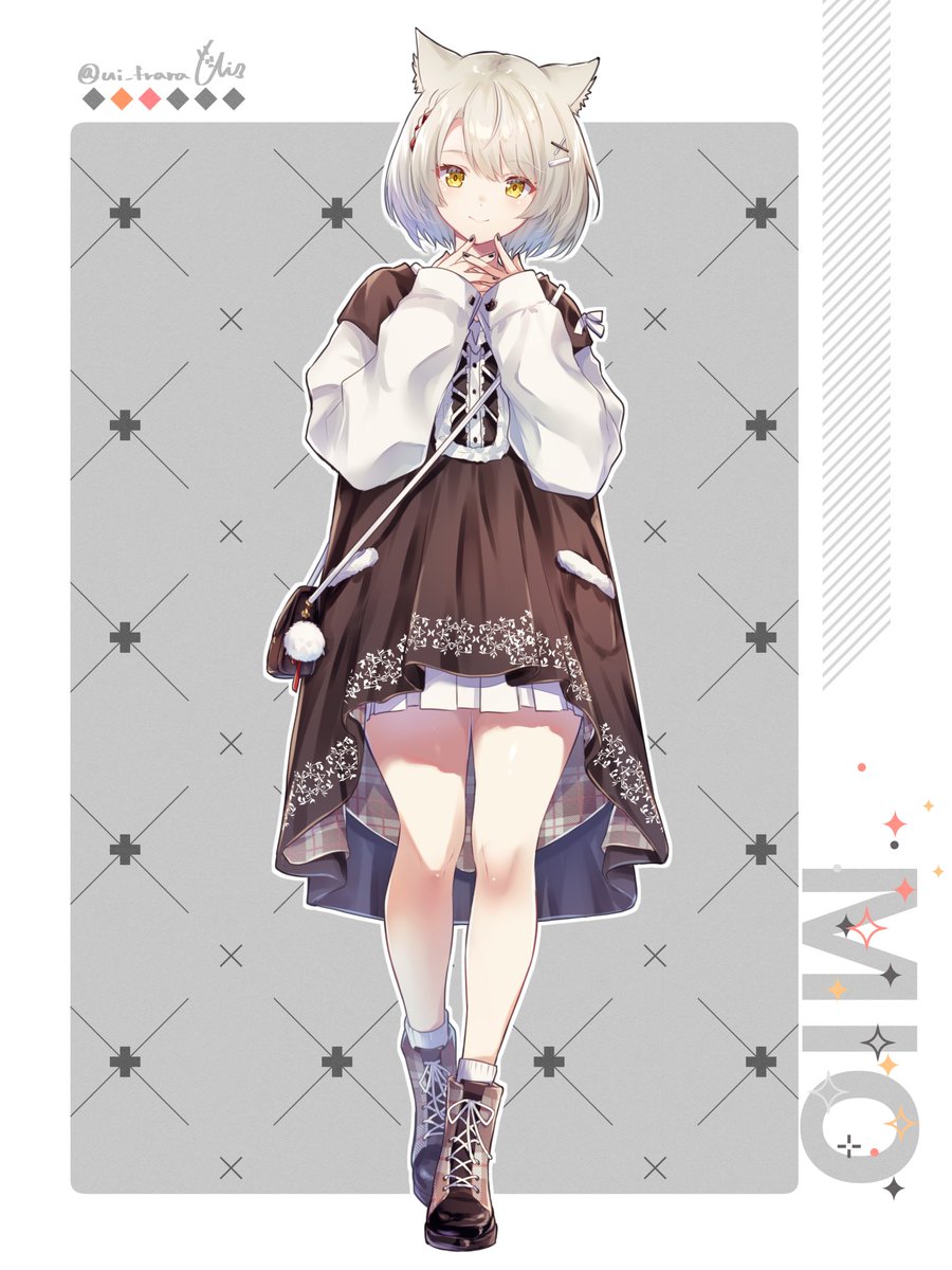 1girlanimal ear fluffanimal earsartist namebootsborderbrown bootsbrown skirtcat earscat girlcharacter nameclosed mouthfull bodygrey backgroundgrey hairlong sleeveslooking at vieweroutside bordershirtshort hairsignatureskirtsmilesolostandingtwitter usernamewhite borderwhite shirtyellow eyes