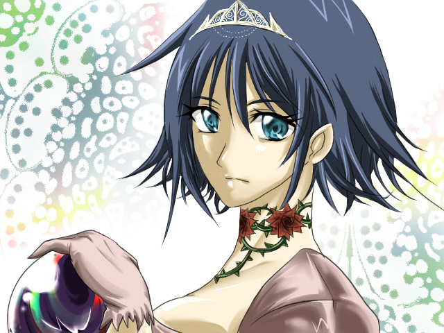 1girlbreastscollarbonedetached collarfemale focusflowerholdinglooking at viewermedium breastsorbred flowerred roserosesolothornstiaraupper body