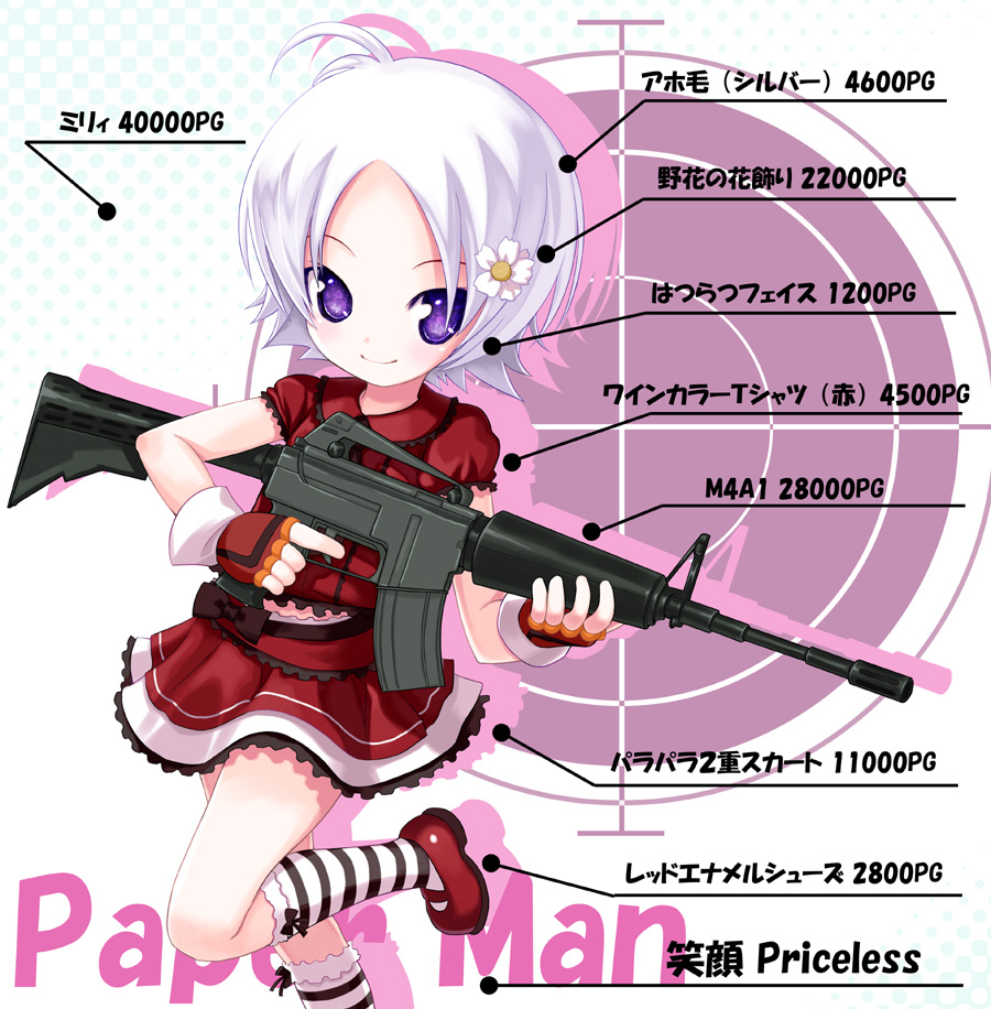 childfingerless glovesglovesgunpurple eyesrifleshort hairskirtsmilesockssolostriped clothesstriped socksweaponwhite hair