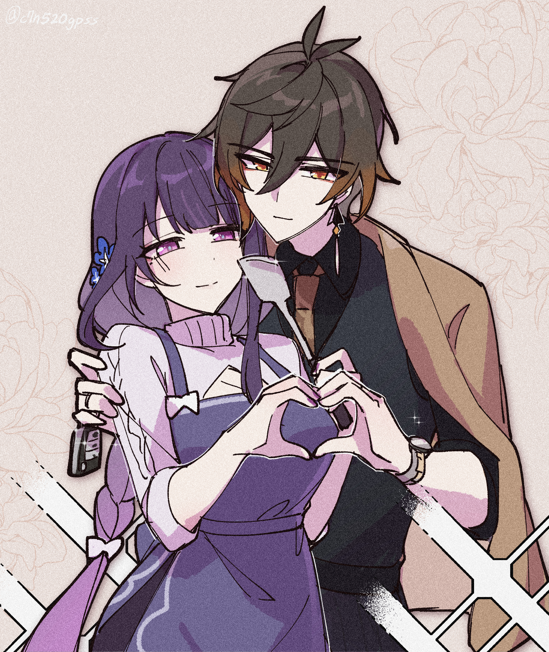 1boy1girlalternate costumeantenna hairapronblack shirtblue flowerblue pupilsblunt bangsblushbraidbreastsbrown backgroundbrown coatbrown hairbrown necktiecenter openingcleavageclosed mouthcoatcollared shirtcoupleearringsflowerflower ornamentgradient hairhair between eyeshair ornamenthead tiltheartheart handsheterojewelrylarge breastslight smilelong braidlong hairlooking to the sidelooking upmolemole under eyemulticolored hairnecktieopen clothesopen coatorange eyespurple apronpurple eyespurple hairpurple nailspurple sweatershirtsingle braidsleeves rolled upstandingsweaterupper bodywatchwristwatch