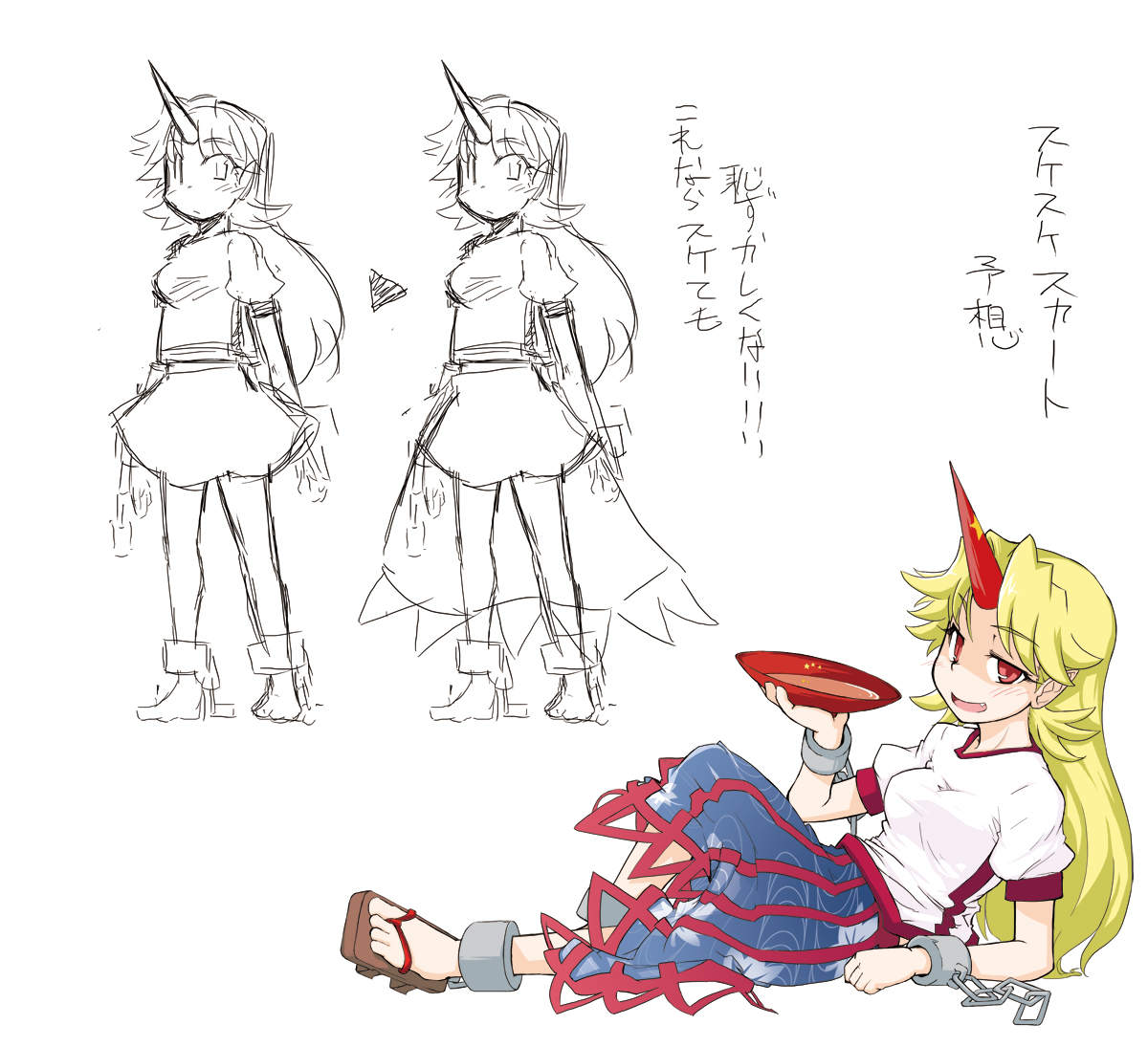 1girlalcoholartistic errorbarefootblonde hairchaincuffscupdrunkfangfemale focushornslong hairpartially coloredpointy earsred eyesreference sheetsakazukisakesandalssingle hornsketchskirtsolowhite background