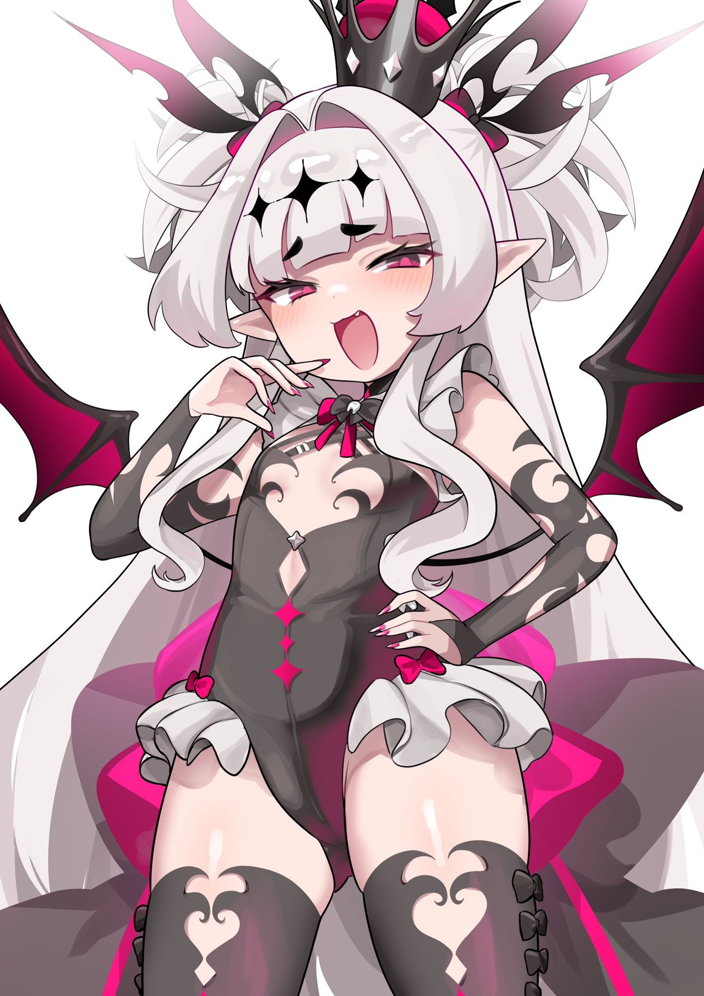 sumino takumi, the hundred line -last defense academy-, absurdres, commentary, highres, 2boys, angel and devil, angel wings, antenna hair, belt, belt pouch, black cape, black hair, black horns, black jacket, black pants, blue eyes, cape, closed mouth, demon horns, dual persona, expressionless, feathered wings, full body, goupaifentiao, halo, holding, holding sword, holding weapon, hole in chest, hole on body, horns, jacket, male focus, multicolored hair, multiple boys, open mouth, pants, pouch, red hair, short hair, simple background, smile, streaked hair, sword, tsurime, two-tone hair, weapon, white background, white belt, white jacket, white pants, white wings, wings