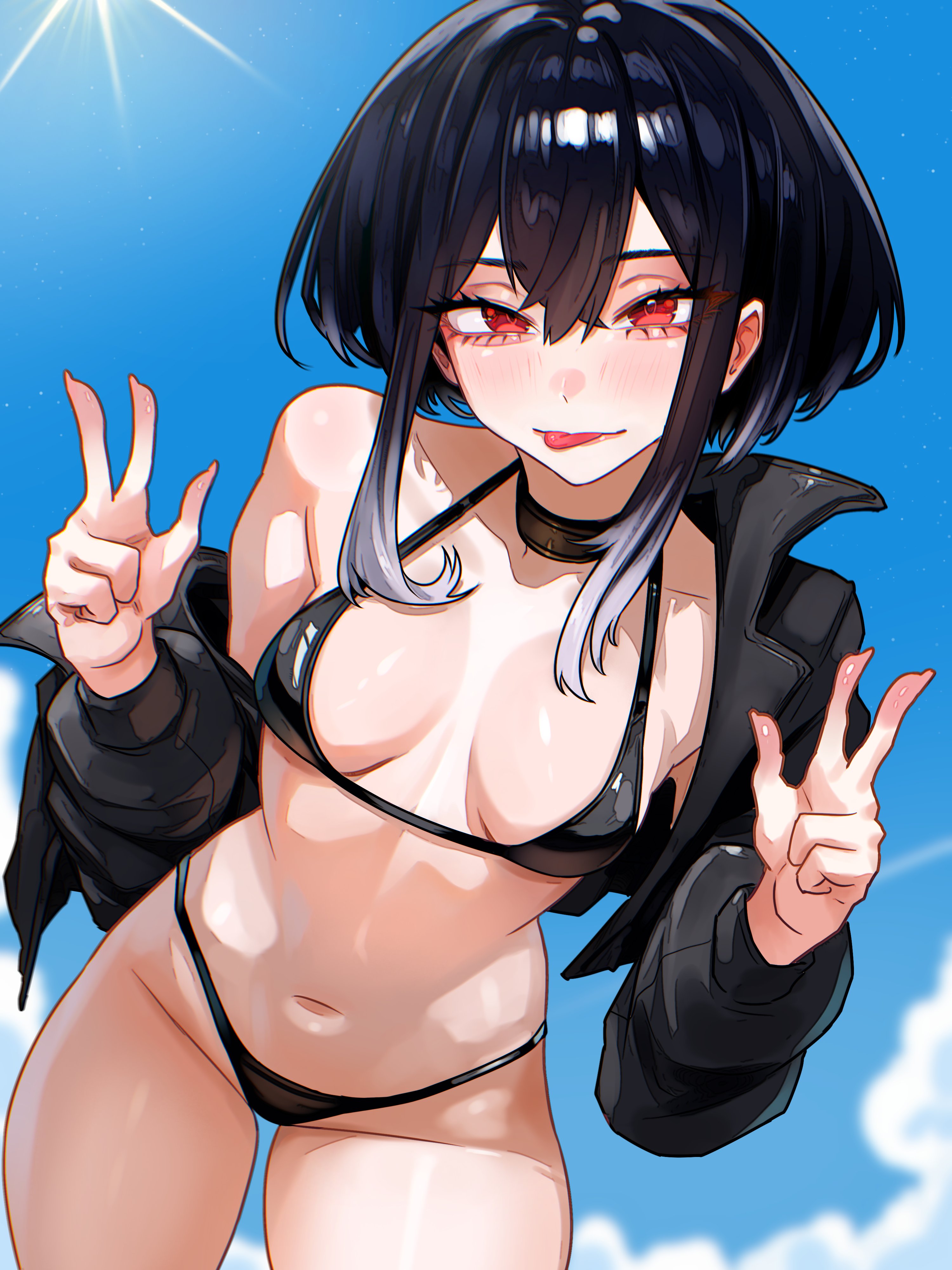 :p1girlbikiniblack bikiniblack chokerblack hairblack jacketblue skybreastschokerclouddaydouble vhair between eyesjacketlong sleeveslooking at viewermedium breastsmedium hairmulticolored hairnavelopen clothesopen jacketoutdoorsskysolospanish commentarystandingstreaked hairswimsuitthighstonguetongue outvwhite hair