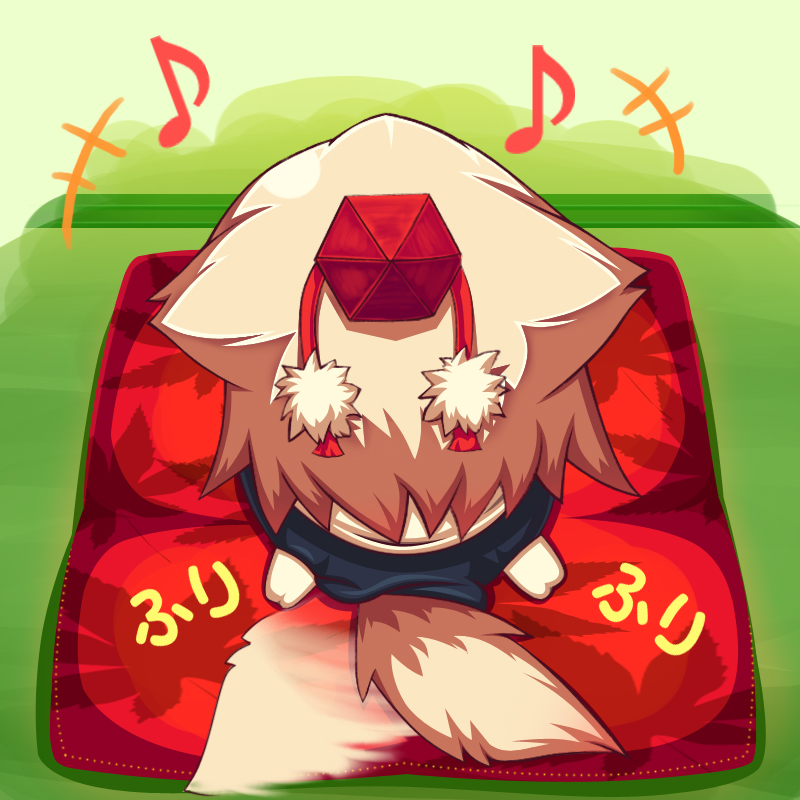 1girlanimal earschibicushionfemale focusfrom abovefrom behindhatmusical notepillowshort hairsittingsolotailtail waggingtokin hatwolf earswolf tail