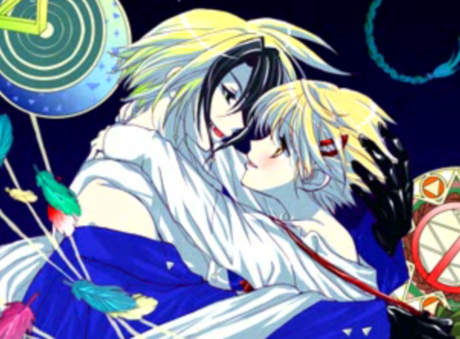 00s1girlbare shouldersblonde haircouplecrossoverfanggrinheteromulticolored hairshirt slipshort hairsmileyellow eyes