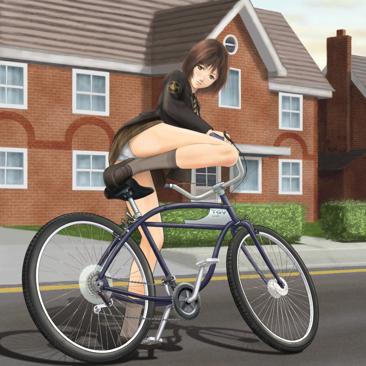 1girlbicycleblushbrown hairfemale focushouselegspantiespantyshotplaid clothesplaid skirtroadschool uniformshort hairskirtsolostreetunderwearyellow eyes