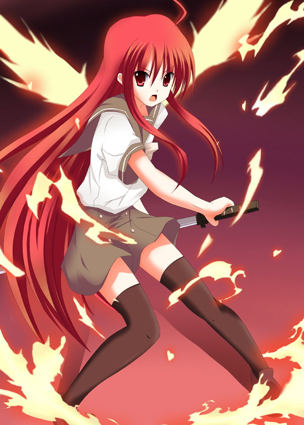 00s1girlfemale focusfiery wingsfirelong hairred eyesred hairschool uniformsoloswordthighhighsweaponwingszettai ryouiki
