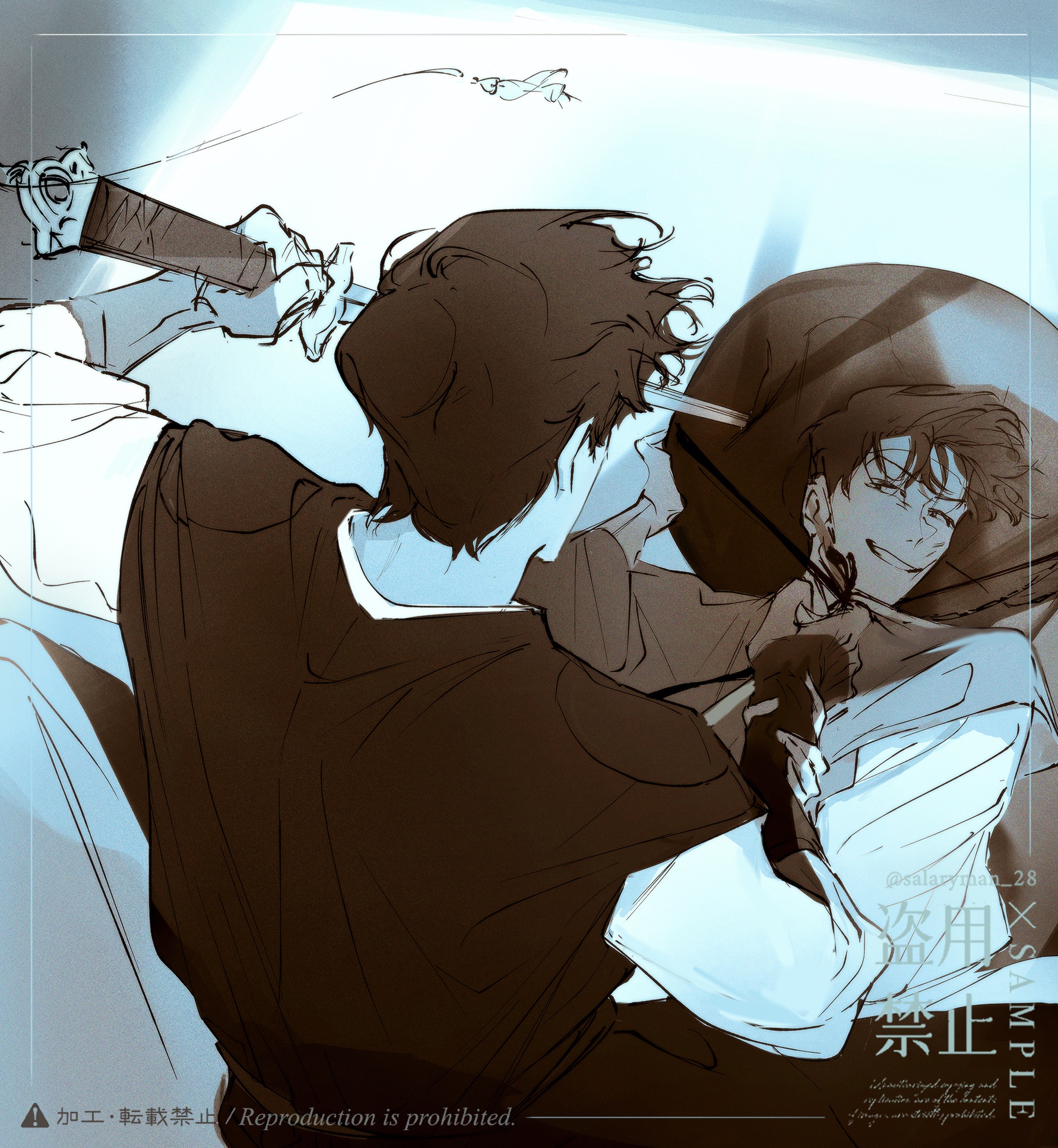 salarymanwaka, kim dokja, yoo joonghyuk, omniscient reader's viewpoint, highres, 2boys, black eyes, black hair, black vest, clothes grab, from above, grin, hand on another's wrist, hat, holding, holding sword, holding weapon, limited palette, looking at another, male focus, multiple boys, shirt, shirt grab, short hair, smile, sword, upper body, vest, weapon, white shirt