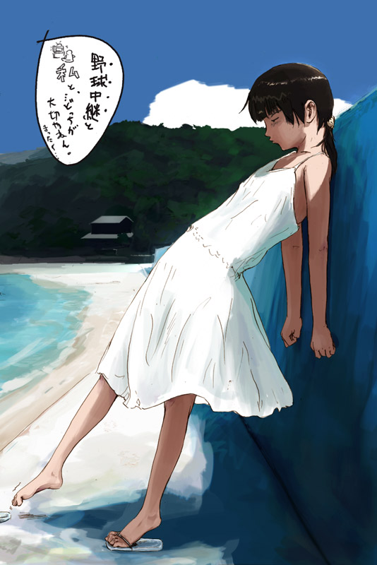 mozuya murasaki, 1girl, bent over, blue eyes, blush, breasts, cleavage, covered erect nipples, female focus, hanging breasts, large breasts, leaning forward, long hair, off shoulder, one-piece swimsuit, pink hair, ponytail, solo, swimsuit, white one-piece swimsuit