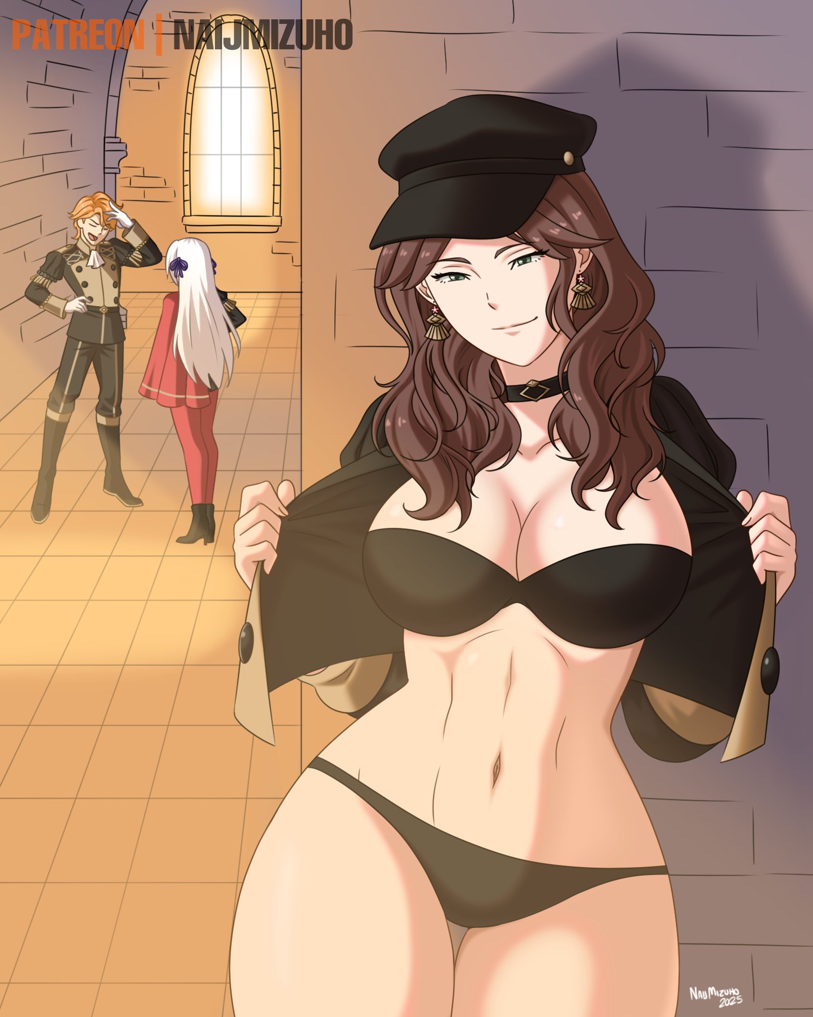 1boy2girlsbreastsbrown hairchokercleavageearringsgreen eyeshatjewelrylarge breastslong hairmultiple girlsnavel