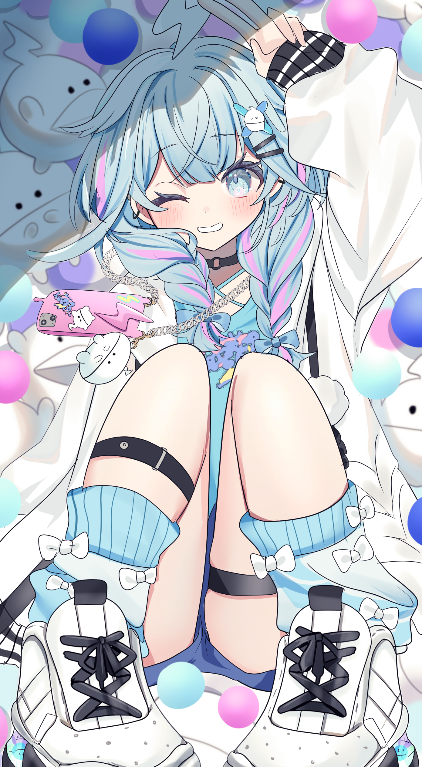 1girlahogeassblue eyesblue hairblue leg warmersblue shirtblue shortsblushbraidbraided sidelockscellphonechainchain necklacecoatfull bodygrinhand upjewelryknees upleg warmerslightning ahogelooking at viewermulticolored hairnecklaceone eye closedphonepink hairshirtshoesshort hairshortssleeves past wristssmilesneakerssolostreaked hairthighstwin braidsvvirtual youtuberwhite coatwhite shoes