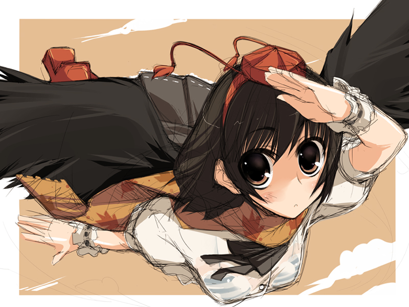 1girlblack hairblack wingsblushbraexpressionlessfemale focusgetahand to headhatlingerielooking at viewersee-through clothesshading eyessketchsolostriped brastriped clothestengutengu-getatokin hatunderwearwingswrist cuffs