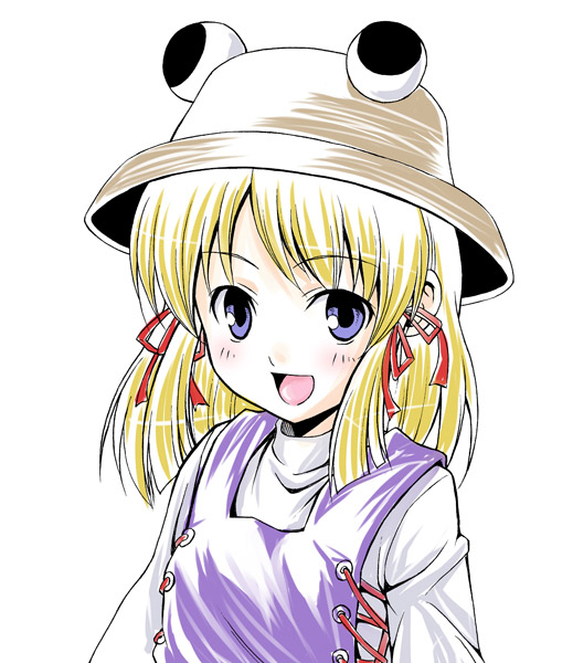 1girlblonde hairblue eyesfemale focushatopen mouthsimple backgroundsmilesoloupper bodywhite background