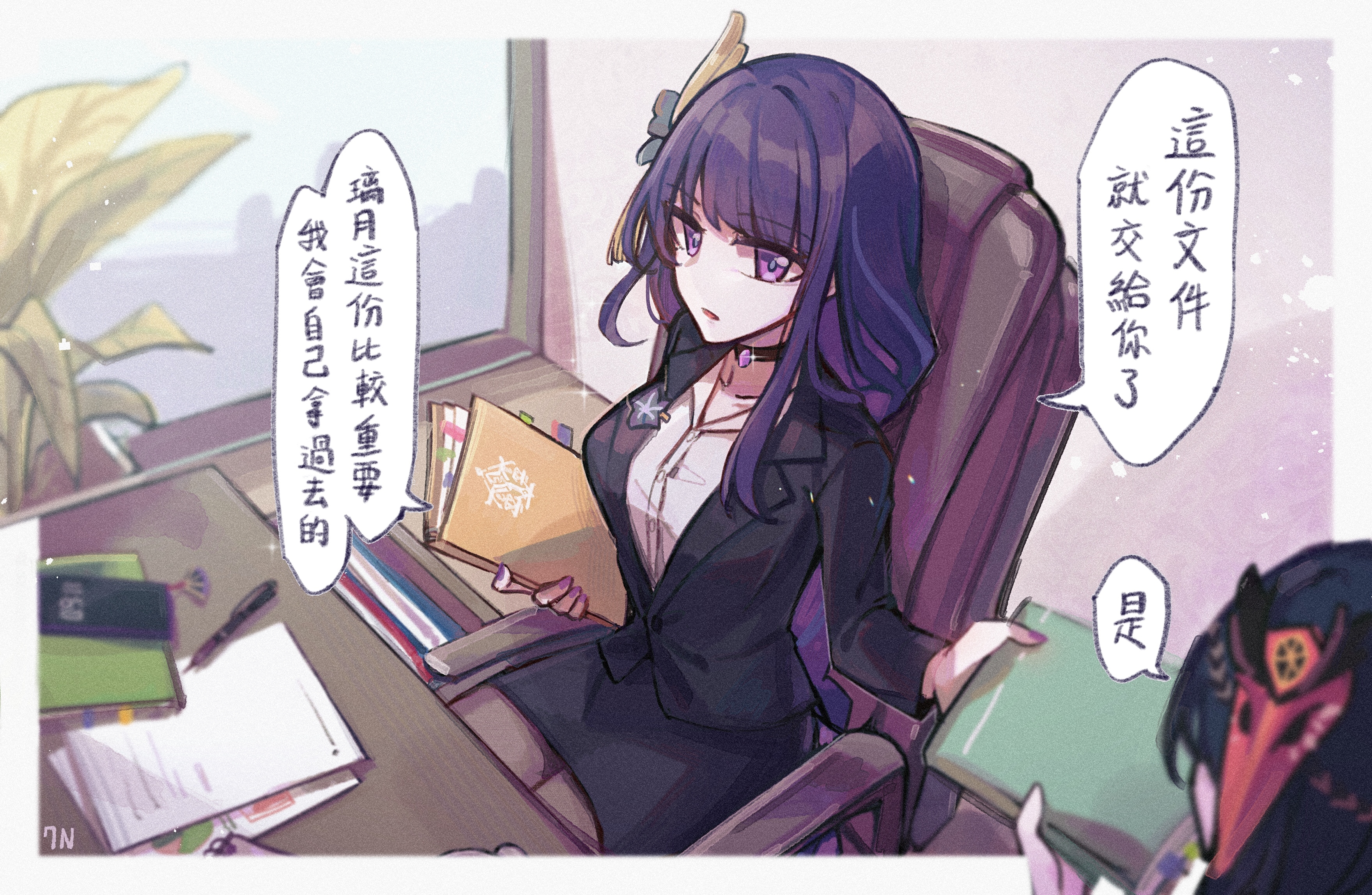 2girlsalternate costumeblack chokerblack suitblue pupilsblue skyblunt bangsblurryblurry backgroundbraidbreastsbusiness suitchairchokercollarbonecollared jacketcollared shirtdepth of fielddeskfolderformal clothesfriendsfrom abovefrom sidehair ornamentholdingholding folderhuge breastsindoorsjacketlong braidlong hairlong sleeveslooking to the sidemaskmask on headmolemole under eyemulticolored eyesmulticolored hairmultiple girlson chairopen mouthpaperplantpurple eyesshadeshirtsingle braidsittingskyspeech bubblestreaked hairsuitwhite shirtwindow