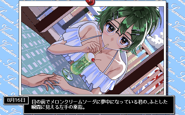 mibu natsuki, translated, 1girl, blue eyes, blue hair, clothes lift, cowboy shot, crotch seam, female focus, hand under clothes, lifting own clothes, matching hair/eyes, panties, panties under pantyhose, pantyhose, school uniform, serafuku, short hair, simple background, skirt, skirt lift, solo, text focus, underwear, upskirt, white background