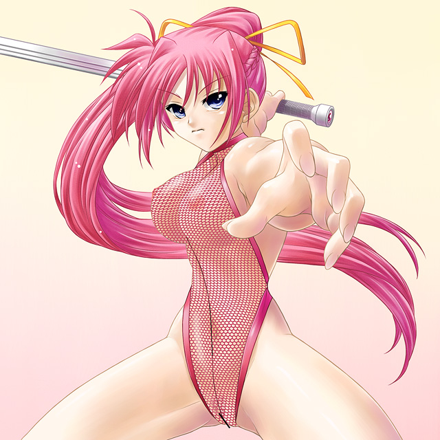 00s1girlblue eyesbreastsfemale focusfishnet topfishnetslong hairpink hairponytailsee-through clothessoloswordweapon