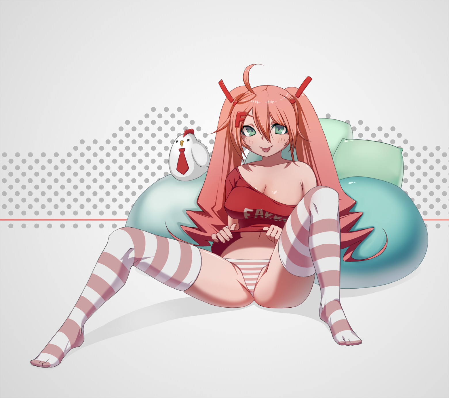 blushbreastschickencleavagefemaleFlag for Deletiongreen eyeshair ornamentlarge breastslong hairlooking at viewermascotnavelnecktieno braoff shoulderpillowpink hairpunsittingsolostripedstriped legwearstriped pantiestied hairtonguetwintails