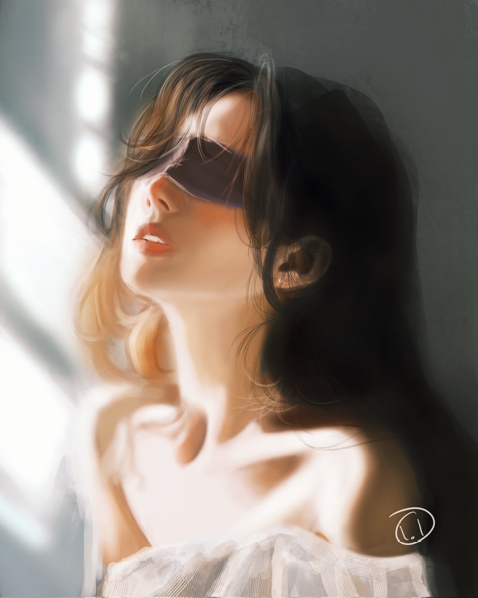 1girlartskiddy69black hairblindfoldbreastscleavagelong hairpainterlyparted lipsshirtsoloupper bodywhite shirtwindow light