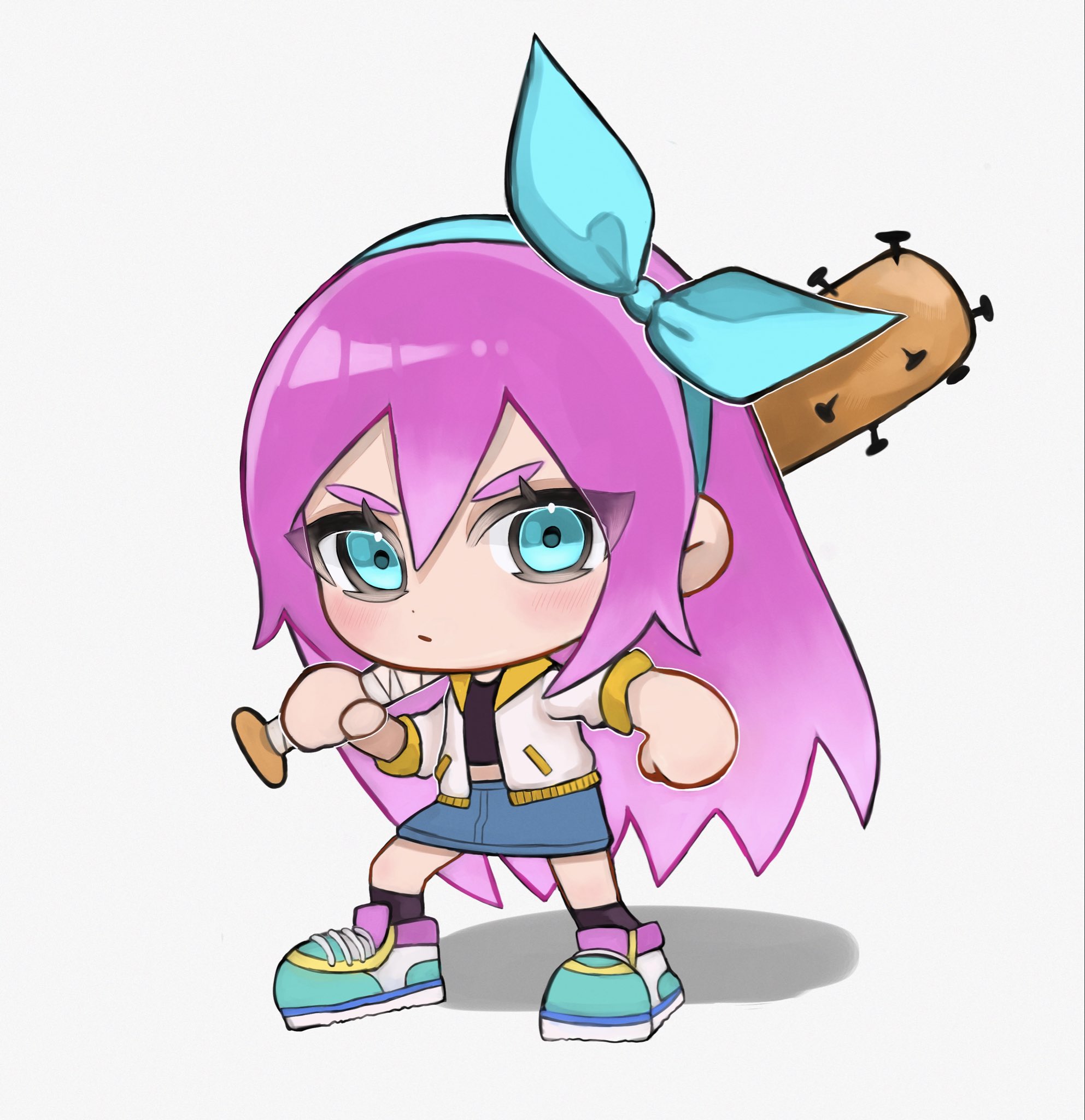 1girlbaseball batblack socksblue eyesblue hairbandblue skirtchibichibi onlyclosed mouthdenimdenim skirtdouble-parted bangsfull bodyhair between eyeshairbandholdingholding baseball batjacketlong hairlooking at viewernail (hardware)nail batpink hairshoesshort sleevesshort-sleeved jacketsimple backgroundskirtsneakerssockssolowaiwaisiyo zewhite backgroundwhite jacket