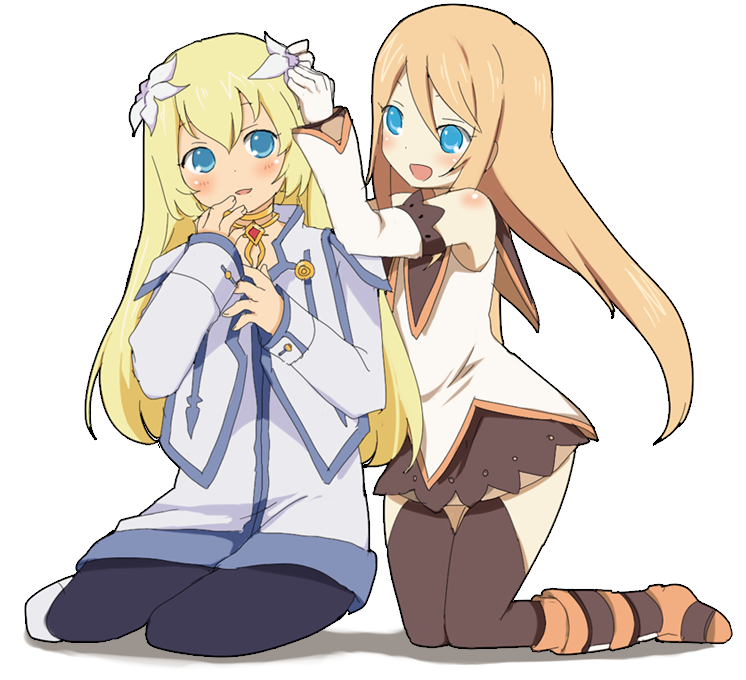 dthmns, shizuko (blue archive), blue archive, highres, ahoge, blue hair, breasts, brown hair, crocs, full body, hair bun, halo, kiss, looking at viewer, multicolored hair, one-piece swimsuit, pink eyes, side-by-side, simple background, skin tight, small breasts, swimsuit, twintails, two-tone hair, v, white background, white one-piece swimsuit
