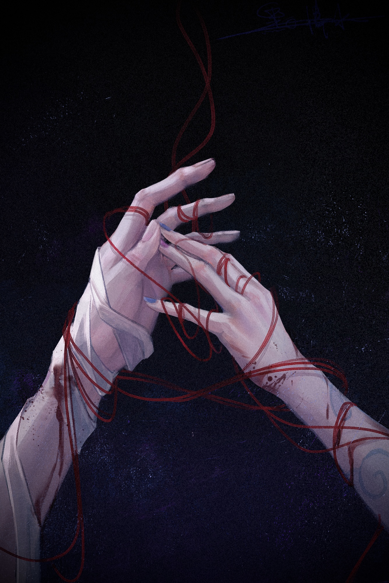 2girlsarm tattoobandaged armbandagesblack backgroundbleedingbloodblood on handsbloody bandagesblue nailscloud tattoocutshand focusinjurylight particlesmultiple girlsnail polishpink nailssimple backgroundstringstring of fatetattoo