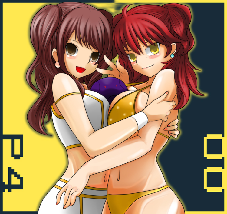 2girlsbetween breastsbikiniblushbreast pressbreastsbrown eyescosplaycostume switchcrossoverdark personadual personaearringsfreckleshugjewelrykujikawa rise (cosplay)multiple girlsnena trinity (cosplay)red hairsmileswimsuitsymmetrical dockingtwintailstwo side upvoice actor connectionwavy hairyellow eyes