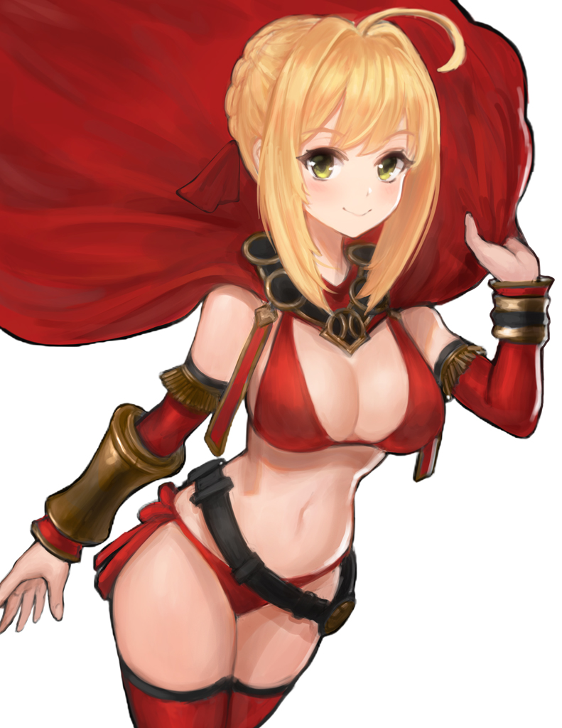 ahogebeltbikiniblonde hairblushbraceletbraidbreastscapecape holdcleavagedetached sleevesgreen eyeshair intakesjewelrylarge breastslooking at viewerred bikinired capered sleevesred thighhighssidelockssmileswimsuitthighhighs