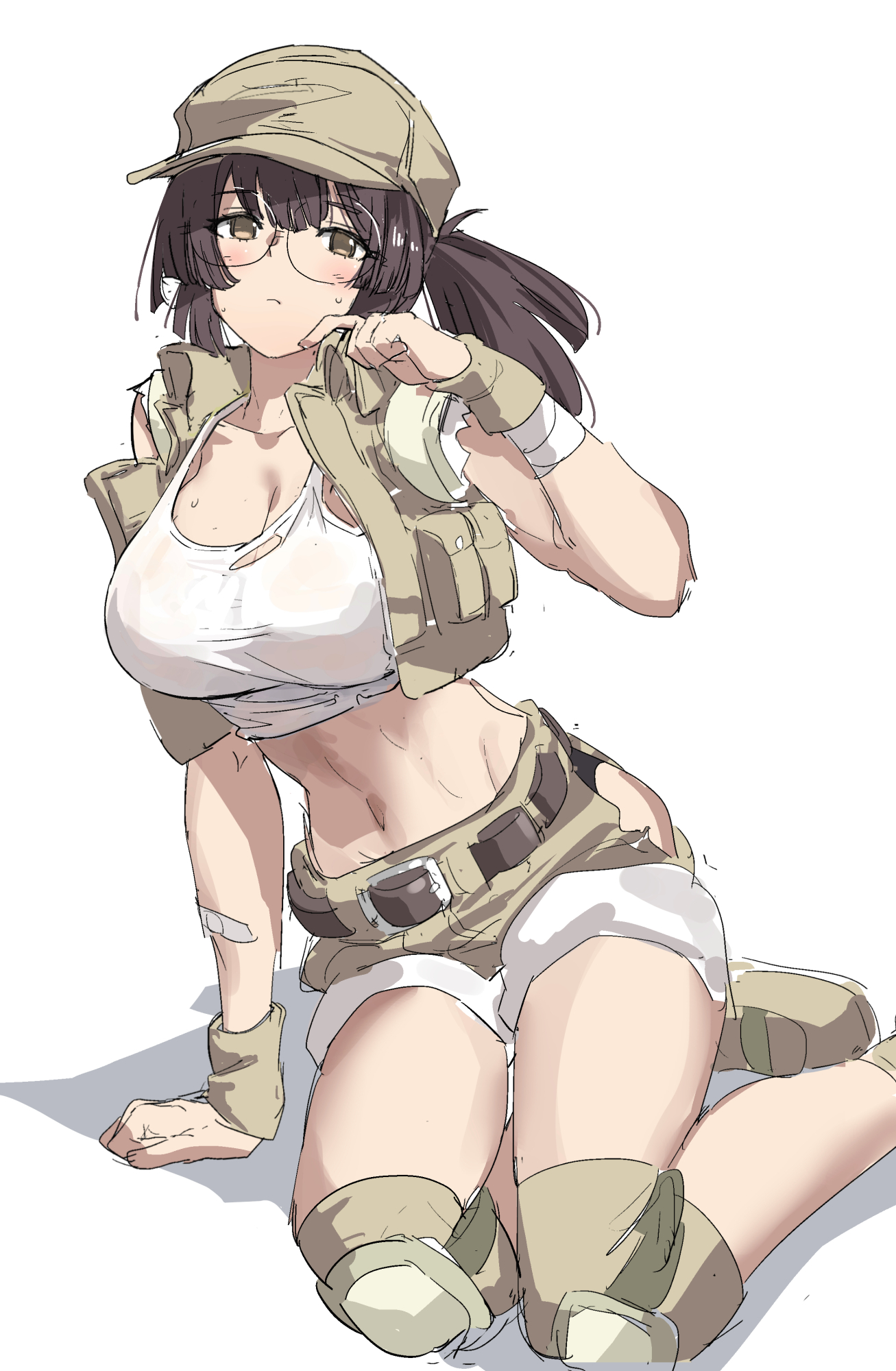 1girlbaseball capbeltbreastsbrown eyesbrown hairclothing cutoutcrop topcropped vestglasseshathip ventknee padslarge breastsmidriffnavelopen clothesopen vestponytailround eyewearshort shortsshortssittingsketchsolosweatutility vestvestwristbandyokozuwari