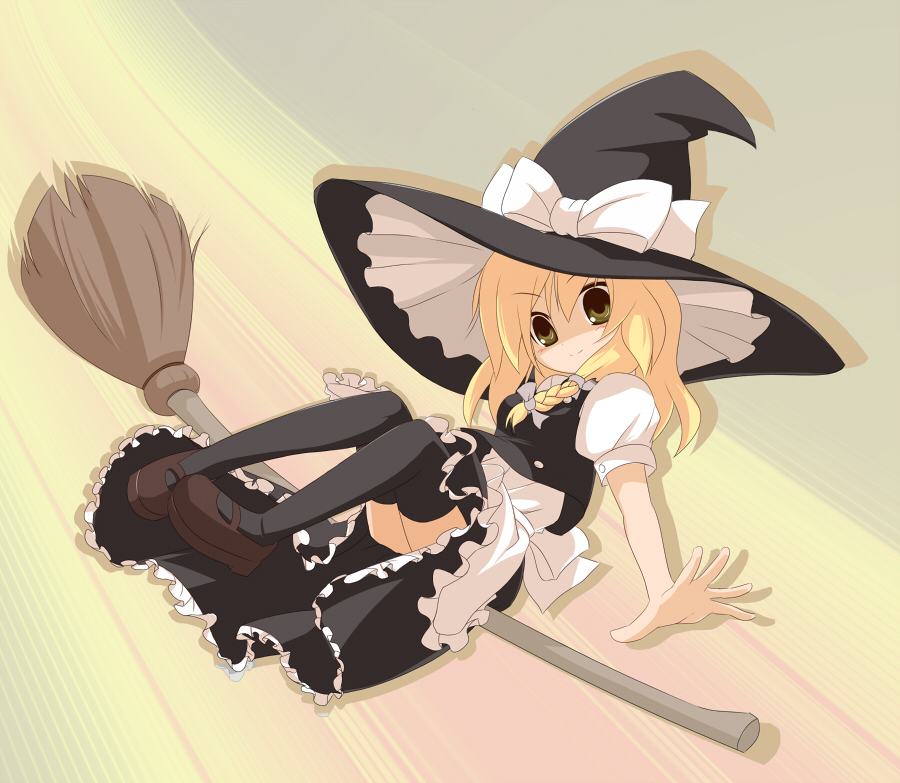 1girlblonde hairbroombroom ridingfemale focushatlong hairribbonsidesaddlesockssolowitchwitch hatyellow eyes