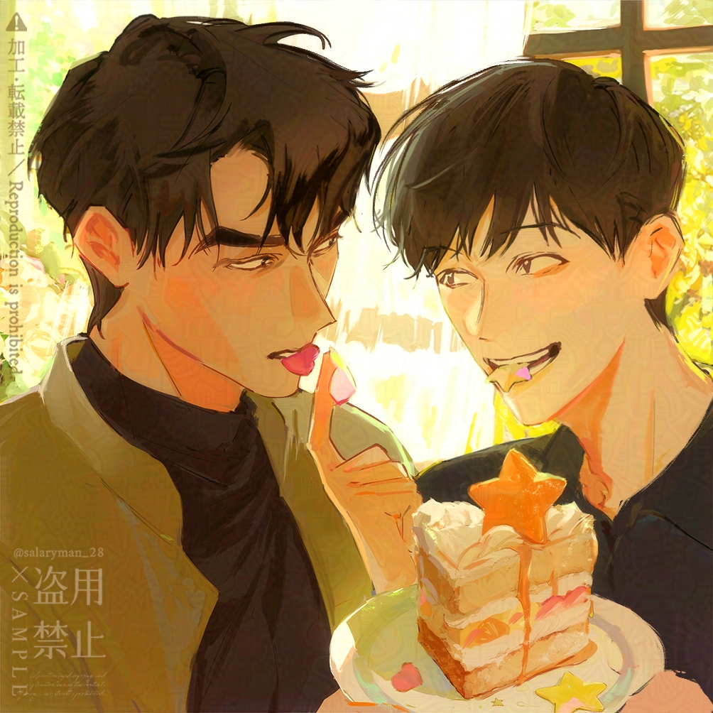 2boysblack eyesblack hairblack shirtcakecake slicecoatcollared shirtcurtainsdayfeedingfoodgrey coatholdingholding platelooking at anothermale focusmultiple boysplateshirtshort hairupper bodywarm coloredwindow lightyaoi
