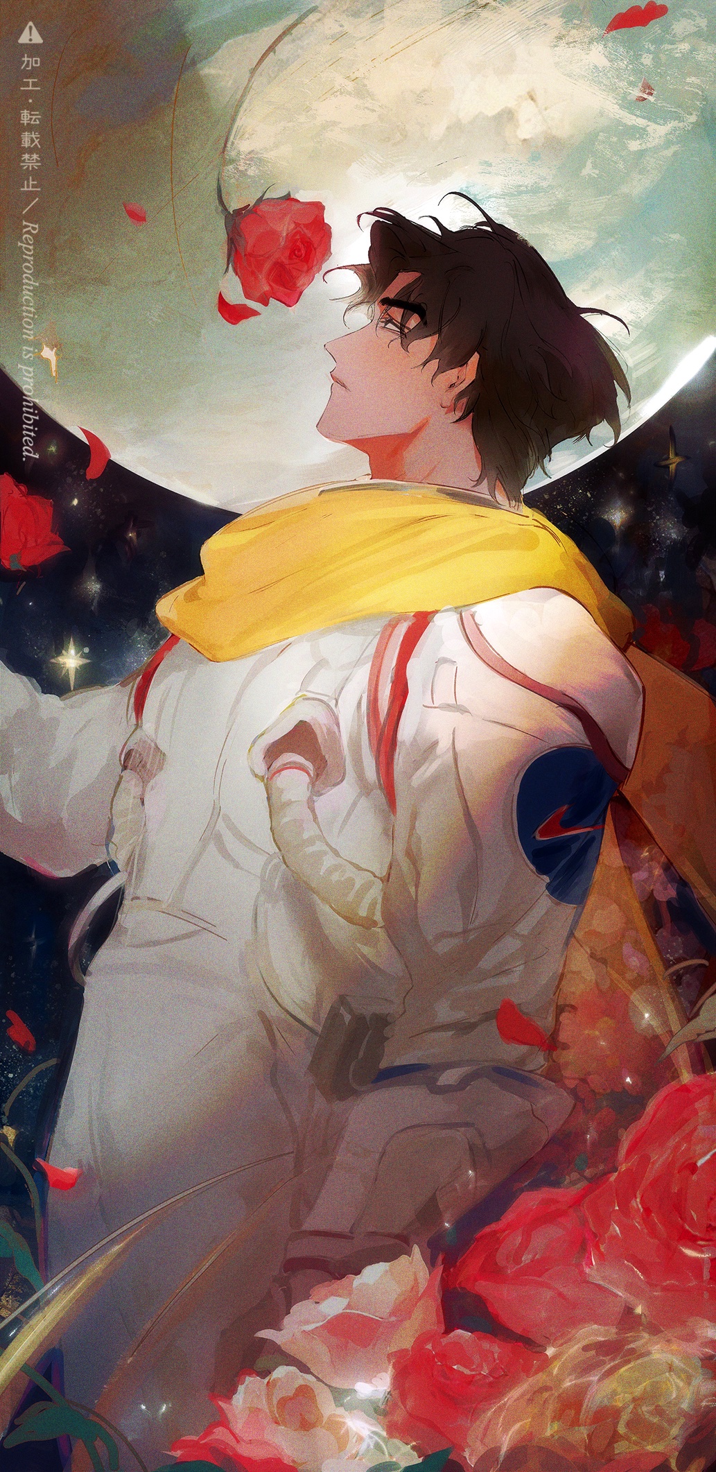 1boyastronautblack eyesblack hairexpressionlessfalling petalsfeet out of frameflowerfrom sidelooking at objectmale focusmoon behind headnightnight skypainterlypetalsred flowerred roseroseshort hairskyspacespacesuitstar (symbol)